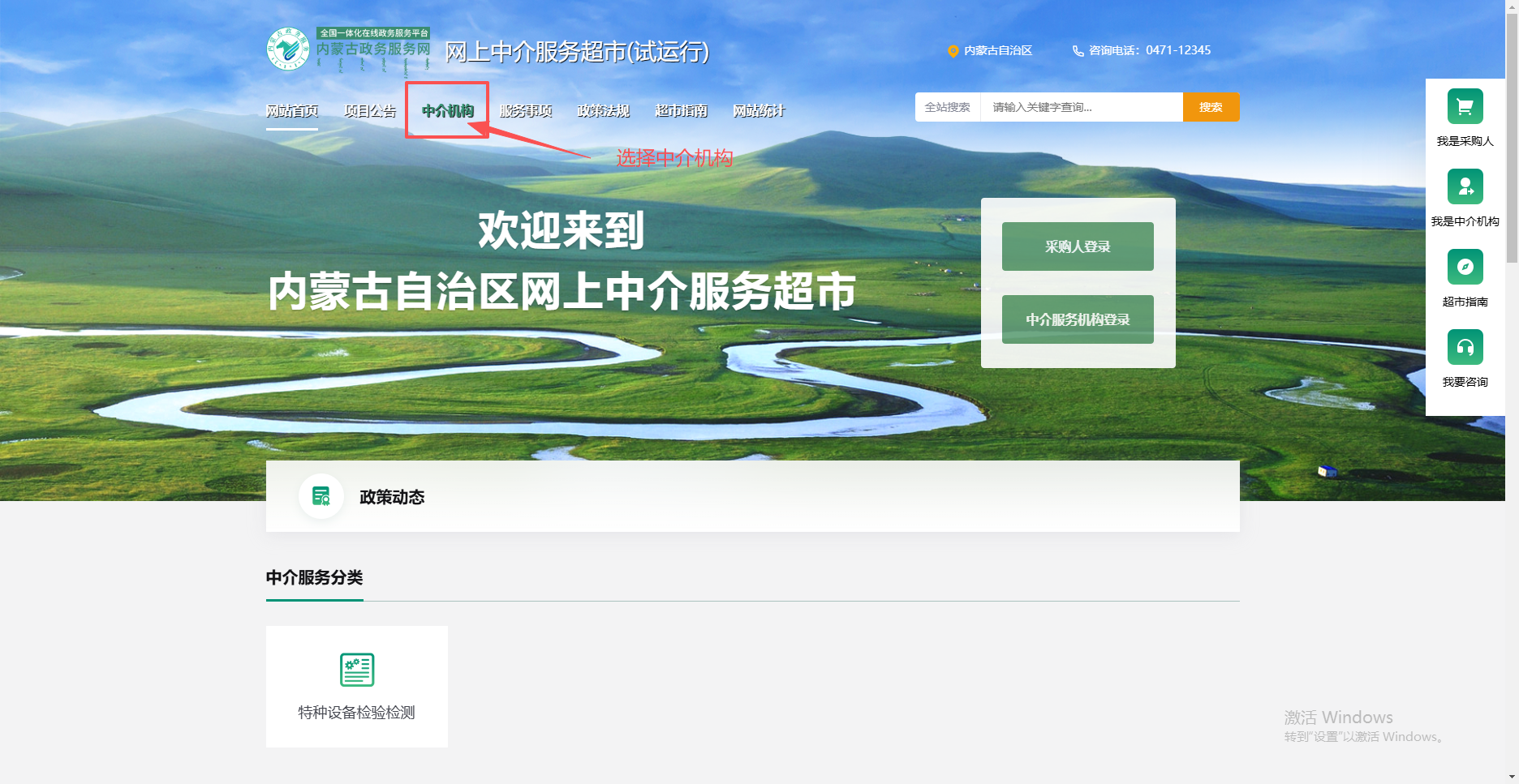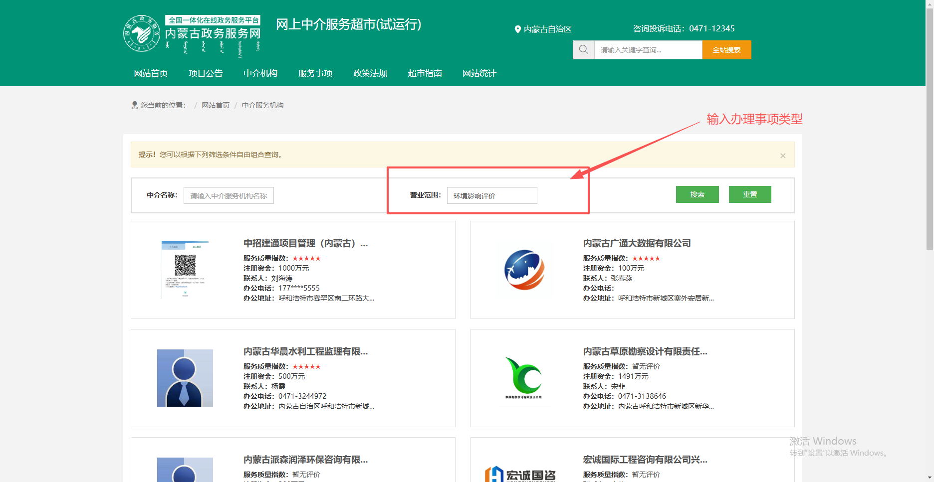可通过百度搜索“内蒙古政务服务网 中介服务超市”官方网站,或直接输入网址:https://zwfw.nmg.gov.cn/zjfw/icity,查询相关情况。