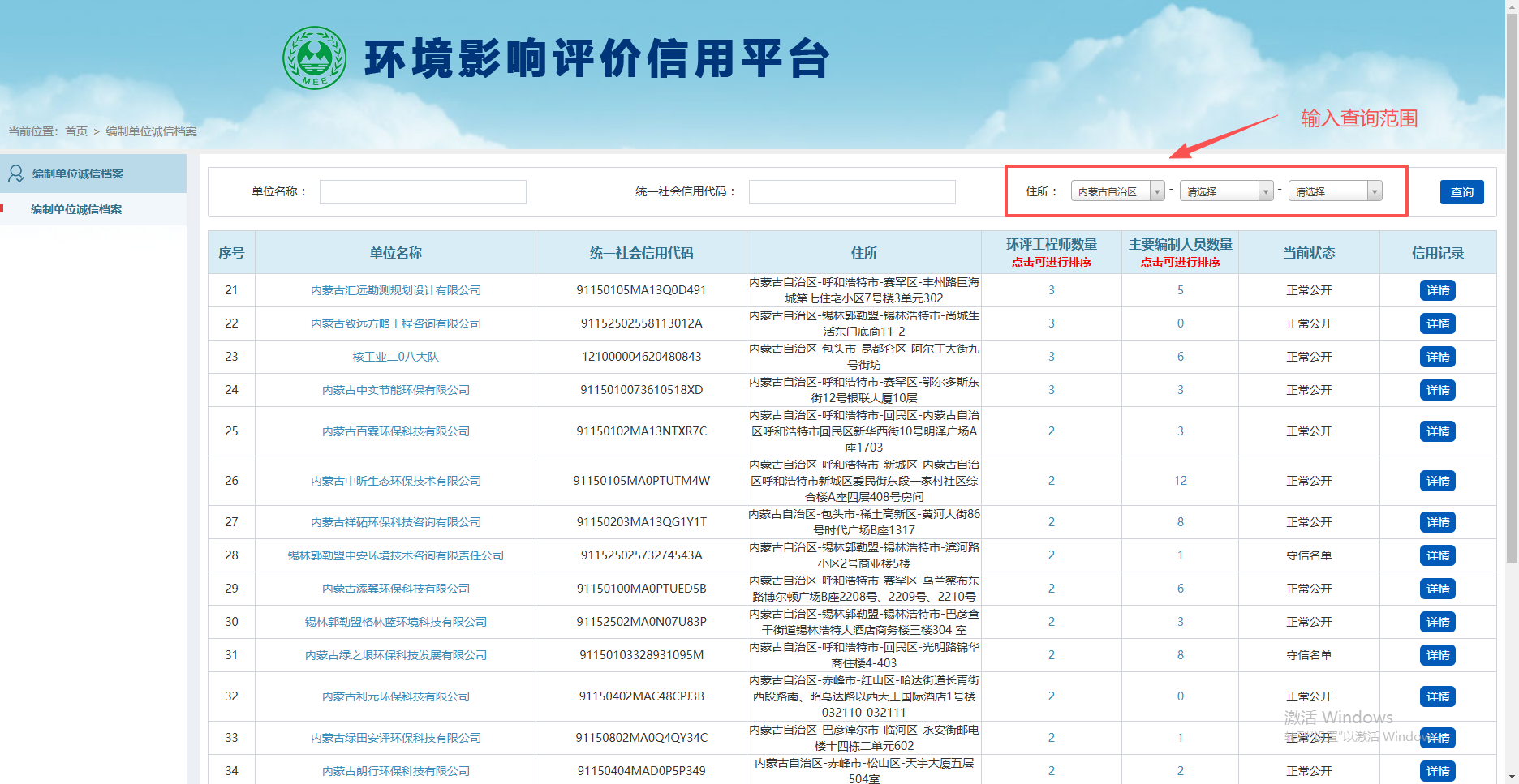 可通过百度搜索“环境影响评价信用平台”官网网站,或直接输入网址:http://xypt.china-eia.com:8080/XYPT/,查询环评单位相关情况。