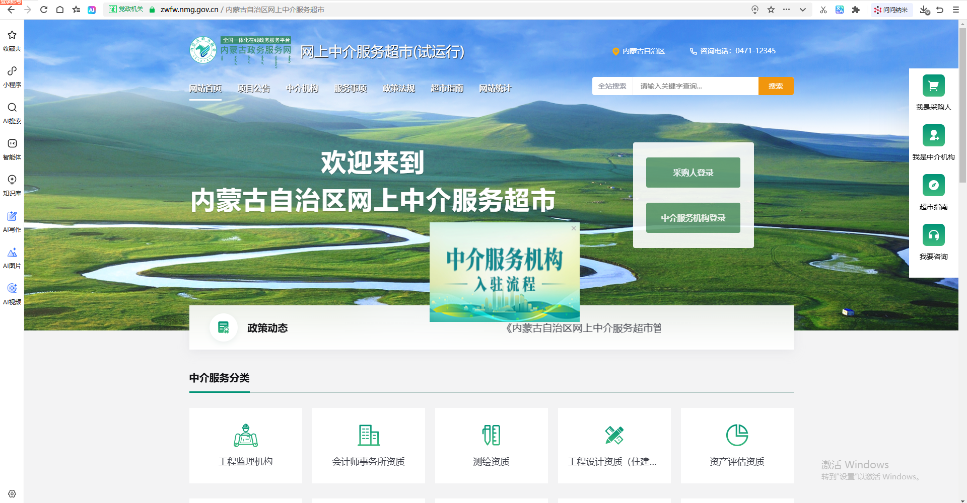 可通过百度搜索“内蒙古政务服务网 中介服务超市”官方网站,或直接输入网址:https://zwfw.nmg.gov.cn/zjfw/icity,查询相关情况。